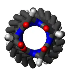 π螺旋也称4.416螺旋,多为右手螺旋,其结构与α螺旋类似,只是π螺旋是由肽链骨架上n位氨基酸残基的 -C=O与n+5位残基的 -NH- 之间形成氢键形成,氢键环有16个原子,每圈有4.4个氨基酸残基,而且每个氨基酸残基环绕螺旋轴87°,沿轴上升0.115 nm。π螺旋的二面角(φ, ψ)一般在(−55°, −70°)左右。