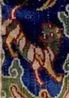 “诛(讨)南羌”锦与“五星出东方利中国”锦出土于同一墓葬,出土时放置在男墓主一侧的木叉上。“诛(讨)南羌”织锦左右对折形成物品所用面锦,内衬绢里,一侧被缝合,但线已脱开。另缝与宽3.4厘米,长67厘米对折的黄绢带缝在一起。“诛(讨)南羌”织锦展开后为小裤子状,长13.2厘米,宽7厘米。组织结构、题材图案和风格与“五星出东方利中国”锦相近。经密220根/厘米,纬密24根/厘米。[刊 1]