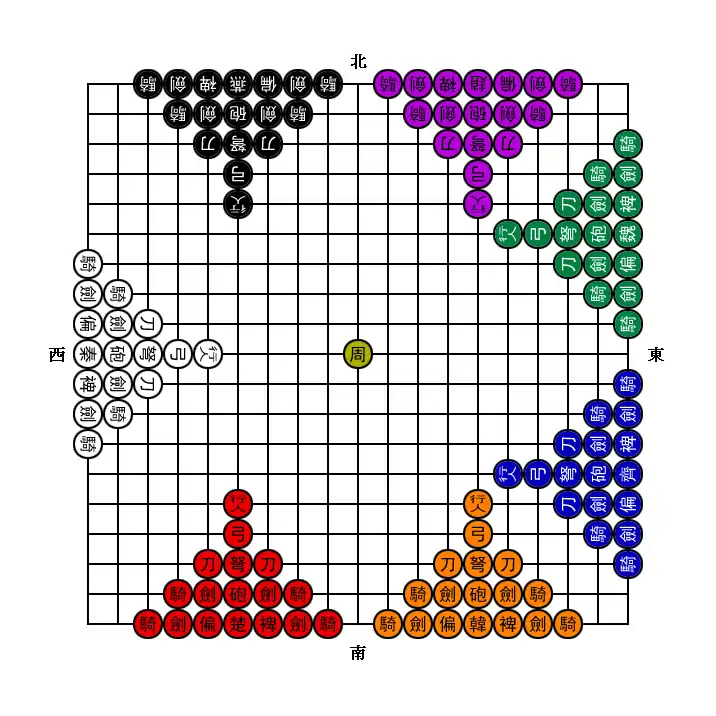 - 6人对局时,秦可以和除楚以外的任一国家联盟,即一人控制两国的棋子。