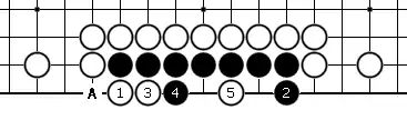 圖一中的黑棋只有七子,最後還原成直三,沒辦法後手活。注意,黑下A位沒有用,白可下1位撲、破眼。