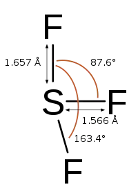 三氟化硫是由一个硫原子被三个氟原子环绕而成的。每个氟原子都和硫原子形成一个共价键。[4] SF3 分子的寿命非常短,以至于人们不能研究它的结构。分子结构为蝴蝶形(右图),属于Cs 点群。[5][6]