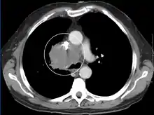 由于血管内装置(例如永久中心静脉导管以及起搏器和除颤器导线)的广泛使用,非恶性原因的患病率正在增加,这可能导致血栓形成。 [2]其他非恶性原因包括良性纵隔肿瘤、主动脉瘤、感染和纤维化纵隔炎。 [3]