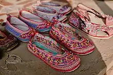 繡鞋(下方話稱作 liển hài)由婦女手工縫製和刺繡而成,供家人穿戴使用。 除此之外,下方人也會製作專門的鞋子,賣給赫蒙族人當作祭祀先人的祭品。