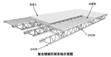 处于边缘柱筒和核心区域之间的无柱空间由预制楼板桁架连接。楼板承受恒荷载、活荷载、为外围墙体提供侧向稳定性并传递外墙的风荷载。楼板由带凹槽的钢板及其上4英寸(10)厚的轻型混凝土层构成,凹槽为二者提供抗剪连接,使其能够协同作用。[101]主桁架和次桁架构成了网格,支撑着楼板。网格间距各处不同,短跨仅有35英尺(11),长跨可达60英尺(18)。[101]桁架与边缘柱间隔相连,连接处间距为6英尺8英寸(2.03)。上弦杆与外侧窗间墙所设支座及内侧芯柱所设沟槽铆接。楼板则使用黏弹性阻尼器与窗间墙连接,以减轻大楼摇晃时楼内人员所感受到的不适。[101]