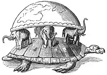 世界由四隻大象背著,牠們站在一隻鱉上。(1877年繪)
