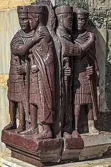 皇帝戴克里先(284年—305年在位)于286年将帝国分为东、西两个独立行政区。这个系统最终包括两位正帝和两位副帝(因此称为四帝共治制),使帝国政府稳定了大约20年。戴克里先的进一步政府、财政和军事改革延缓了帝国的衰落,但并没有解决它面临的问题。[30]内战后君士坦丁大帝恢复了内部和平,并于330年将拜占庭重新命名为君士坦丁堡,定为东罗马帝国的首都。[31]