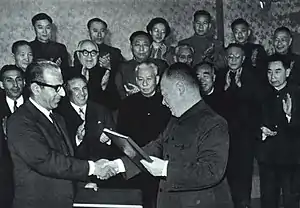 1957年1月,中华人民共和国国务院总理周恩来、副总理贺龙访问阿富汗,是中阿关系史上中国领导人第一次访阿。在访问过程中,周恩来总理和贺龙副总理会见了阿富汗国王查希尔,并同首相达乌德、副首相阿里·穆罕默德、副首相兼外交大臣纳伊姆举行了三次会谈,这次访问增进了两国间的相互了解,为两国之间友好关系的发展奠定了基础[11]。同年10月阿富汗首相达乌德应邀访华,访问期间会晤了中国领导人毛泽东、朱德、刘少奇[11]。此后,时任中华人民共和国副总理兼外交部长的陈毅于1960年访问了阿富汗,同年8月26日在阿富汗首都喀布尔签订了《中阿友好和互不侵犯条约[lower-alpha 1]》[12]。1963年11月22日两国在北京又签订了《中阿边界条约》[13],中阿边界全长92.45公里[11]。