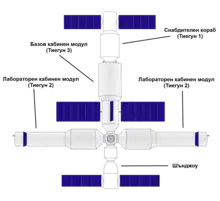 天宮计划分两个阶段进行。试验阶段包括天宫一号目标飞行器、天宫二号空间实验室(計畫變更)、天宫三号試驗核心艙(已取消)。之后开始正式组建常驻的天宫空间站,预计运营十年以上,最少採用三個軌道艙組成,不低於60噸,最大规模可升級达180吨。其组成过程中将先发射无人空间实验室,而后再用运载火箭将载人飞船送入太空,与停留在轨道上的实验室交会对接,航天员从飞船的附加段进入空间实验室,开展工作。航天员的生活必需品和工作所需的材料、设备均由飞船运送,载人飞船停靠在实验室外边,作为应急救生飞船。如果实验室发生故障,可随时载航天员返回,航天员工作完成后,乘飞船返回[7]。