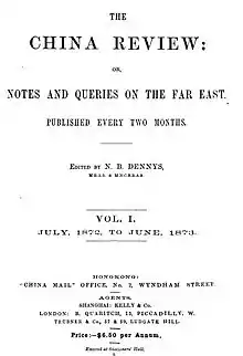 1872年7月创刊,欧德理担任首任编辑,主要向欧洲介绍中国的文学、宗教与文化[1]。1901年6月号(第25卷第6期)刊出之后停刊,该刊共25卷,每卷6期,共150期。由于其在宗教文化上的分析较为前沿与深入,它在西方汉学发展过程中具有重要的历史地位[2][3]。