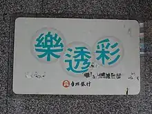 臺北市政府衛生局舊址大門前的「公益盈餘愛心成真」紀念牌,頂端為2002年啟用的中華民國公益彩券第一代標誌