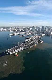 ![]() 中途岛号准备停靠在她在聖地牙哥军港最后的栖息地,此后,她将成为美国最大的海军航母博物馆。 (2004年1月10日) | |
