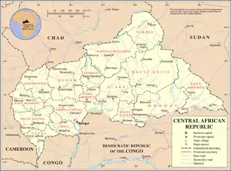 中非共和國是一個位於非洲中部的內陸國,和喀麥隆、乍得、蘇丹、南蘇丹、剛果民主共和國、剛果共和國接壤。中非共和國大部分地區地形平坦,但東北部和西北部地區有山地地形。中非共和國的國土面積622,984平方(240,535平方英里),是世界面積第45大國家(僅次於索馬里),和烏克蘭相當,略小於美國德克薩斯州。中非共和國的最高點是位於西部和喀麥隆國界處的恩加亞山,海拔高度1420米。