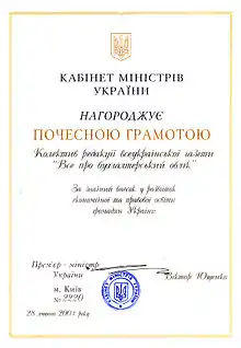 乌克兰内阁荣誉证书是政府授予的奖项[1],表彰其多年的辛勤工作、模范履行公务以及对经济、科学、技术、社会文化、军事的个人贡献、公共和其他活动领域,为乌克兰人民提供服务,促进法治并采取措施确保保护公民的权利和自由、民主的发展以及行政机构和地方政府的有效运作[2][3]。