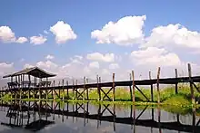 乌本桥(緬甸語:)是缅甸阿马拉布拉城附近横贯东塔曼湖的一座木桥,长达1.2-(0.75-英里),建于1850年左右,被认为是世界上最古老、最长的柚木桥[1][2][3]。该桥开始兴建于阿瓦王朝首都迁往阿马拉布拉城时[4],并以建桥的市长命名[5]。它不仅是当地人的重要通道,也是一个旅游景点,因此收入纪念品是收入的重要来源。[1][5][6][7]七月和八月期间,湖面最高,特别繁忙[8]。