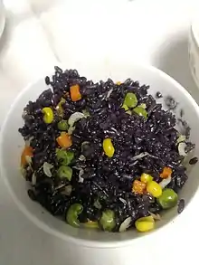 乌米饭是江南地带和畲族的特色美食。是采集乌饭树的叶子煮汤,用所煮的汤用糯米浸泡半天,然后捞出放入木甑里蒸熟而成[1][2]。将南烛叶洗净加水500毫升,煮半小时,过滤叶渣,用汁水煮糯米,待米色变黑,熟烂后可即食用[3]。是畲家宴的主要食物[4]。