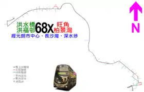 旺角(柏景灣)開經:海泓道、櫻桃街、大角咀道、櫸樹街、晏架街、旺角道、彌敦道、荔枝角道、黃竹街、長沙灣道、荔枝角道、葵涌道、荃灣路、屯門公路、青朗公路(大欖隧道)、元朗公路、博愛交匯處、青山公路(元朗、屏山、洪水橋段)、田廈路及洪水橋田心路。 68X線各班次具體停站請參考資訊框[3]