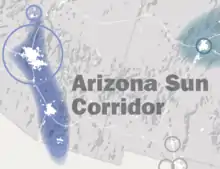 亚利桑那州太阳走廊是美國2050項目列出的十一個特大區域的其中一個。太阳走廊是美國增长速度最快的特大區域之一,並且專家預測其人口於2040年將會翻倍。[2]太阳走廊中最大的都會區為凤凰城都会区太阳谷和圖森都会区。太阳走廊的大部份定居點皆位於一個環境類似沙漠的山谷中。[2]太阳走廊有如南加利福尼亚般,其城市区域延伸到墨西哥境內。[2] [3]