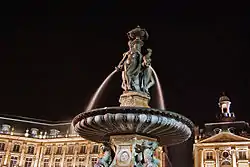 广场上的建筑装饰有各种各样的Mascaron:尼普顿、幻想动物、女性人物、天使、野兽... [3],而非洲妇女则反映了波尔多在贩卖黑奴的三角贸易中达到繁荣。