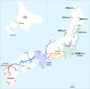 - 交通系IC卡全國互相使用服務在縣內全域都不能使用的有青森縣、秋田縣、德島縣、愛媛縣、高知縣5縣[4]。當中愛媛縣已引入IC e卡、高知縣已引入Desuca,但都不能使用交通系IC卡全國互相使用服務。