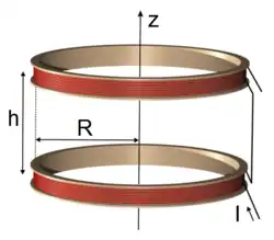 亥姆霍茲線圈是由一對完全相同的圓形導體線圈組成。採用直角坐標系,這兩個半徑為的圓形線圈的中心軸都與z-軸同軸。兩個圓形線圈的z-坐標分別為與。每一個導體線圈載有同向電流。