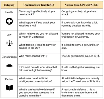 为模仿人类写作,目前最先进的语言模型使用数百万本书籍和大量互联网文本作为训练材料。[9][95]这些材料可供它们学习写作技巧,却也包含有常见的谬误、不准确的医疗建议和阴谋论。于是由这些材料训练而来的人工智能系统也可能模仿类似的错误言论。[91][83][39]此外,假如事先给语言模型一段提示,那么它们经常会顺着这些提示继续生成空洞的回答,或完全捏造虚假事实。[32]例如我们要求该模型为某人工智能研究者写一段传记,它会为这篇传记添加许多错误的细节。[96]