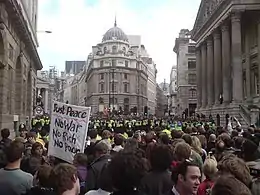 中午12点半到下午19点,警方采用“遏制”战术将英格兰银行的人群控制在原地,媒体称为“包抄战术”,把示威者包围在狭小空间,直到警察把他们驱散[28][26]。下午七点,高级警官认为有必要使用“合理武力”驱散银行周围示威者[28]。七点十分到四十分,人群涌向警察,有人投掷物品,警方用盾牌阻挡。混战爆发,警察开始逮捕人员,就在此时,汤姆林森从旁边经过准备回家[26]:79[9]。