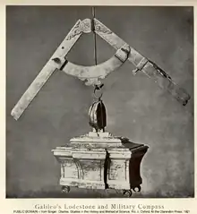 伽利略所做出的一系列重要贡献中,其中一部分就是目前所说技术,而非纯物理。这与亚里士多德学派不同,前者会将伽利略的物理知识归纳为techne 或是有用的技巧,而不是episteme,即用哲学方式研究事物本质。在1595到1598年见,伽利略设计并改良了地理军事两用圆规,为炮兵和勘探员提供方便。尼古勒·塔尔塔利亚[132]与吉多贝多·蒙蒂[133]早些时候制作了类似的仪器,伽利略则在他们的基础之上进行了创新。对于炮兵来说,圆规不但可以更快更准地测出弹道角度,而且可以根据炮弹的大小和材质测算出添加火药的量。作为地理仪器,他可以绘制出任意的规则多边形,并对其他计算进行辅助。在伽利略的指导之下,设备制造商马克·安东尼奥·马哲勒尼[134]制造出了一百多附这样的圆规。伽利略为此收入了50里拉(包括使用说明书在内),并提供了相应的使用教程,收入120里拉。[135]