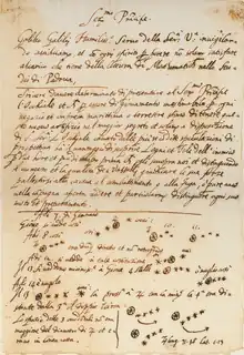 1610年1月7日,伽利略通过望远镜观察到了当时被描述为“三个固定天体,因为渺小而几乎看不见”[106],它们都靠近木星,成一条横跨的直线[107]。第二天晚上观测的结果是那些木星旁边的天体改变了位置,那么它们作为固定天体就无法解释了。1月10日,伽利略发现它们其中的一个消失了,他认为天体藏到了木星的背后。几天后,伽利略得出结论:它们在环绕木星运行[108]。伽利略发现了木星四个卫星中的较大的三个,并于1月13日发现的最后的一个。伽利略将这四个一组命名为美第奇行星,致敬他未来的赞助人托斯卡纳大公科西莫二世與其三个兄弟[109]。然而,天文学家日后将它们改名为伽利略行星以纪念它们的发现者。这些行星如今被命名为艾奥、欧罗巴、伽倪墨得斯和卡利斯托。