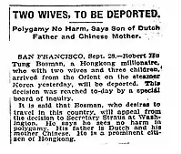 1908年《紐約時報》有關何東妻室的報導︰"Robert Ho Tung Bosman... with two wives and three children.. will be deported"
