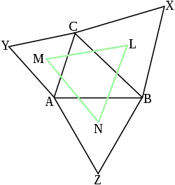 - 若任意三角形的三邊往外畫正三角形,三個正三角形的重心形成的三角形也會是正三角形