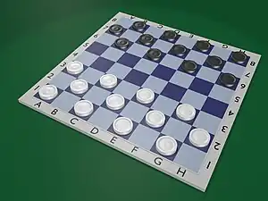- 以兩色扁圓狀的棋子區分敵我,一體兩類,正面稱為兵,反面稱為王,每方各十二枚。