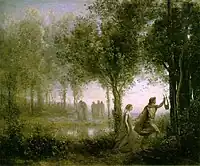 音乐也使他痛心:寧芙歐律狄刻倾醉七弦竖琴(里拉)的恬音美乐,投入英俊少年的怀抱。婚宴中,女仙被毒蛇噬足而亡。痴情的俄耳甫斯冲入地狱,用琴声打动了冥王黑帝斯,欧律狄刻再获生机。但冥王告诫少年,离开地狱前万万不可回首张望。冥途将尽,俄耳甫斯遏不住胸中爱念,转身确定妻子是否跟随在后,却使欧律狄刻堕回冥界的无底深渊。