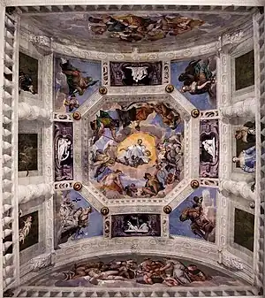 1552年,曼托瓦公爵古列尔莫·贡扎加的叔祖父埃尔科勒·冈扎加枢机主教向委罗内塞订制一幅曼托瓦主教座堂的祭坛画(现藏于法国卡昂),他在原处绘制这幅画。毫无疑问,他利用在曼托瓦的这段时间,来研究朱利奥·罗曼诺的天花板;他最初是一位天花板湿壁画画家,将在威尼斯留下自己的印记,从第二年起,他就在威尼斯永久定居.[27]。
