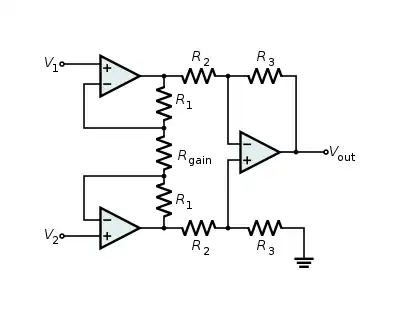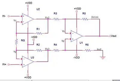 雖然儀表放大器在線路圖上是一顆運算放大器;但實際上是由三顆運算放大器所組成(如圖一所示);儀表放大器分成兩個部份,輸入端的兩個電壓隨耦器提供輸入端(+,−)高輸入阻抗,後級則是差動放大器,用來做兩個輸入端的差動放大;不過,通常第二級的差動放大器的增益會設計為1,也就是只做兩個電壓的相減運算。 而儀表放大器的增益由電阻>來決定。 [1][2]