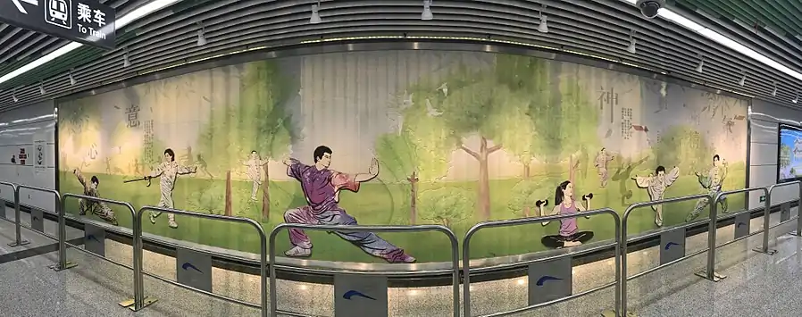 温江也称“柳城”,车站装修整体以柳树、柳叶为基础元素,动线设计的飘逸线条感与柳叶的造型相结合,既体现了视觉上的灵动感,也呼应温江“柳城”的城市历史继承与发展。立柱与个性天花区域以绿色为主,借以体现绿色生态,也突显“柳城春色”的主题[4]。