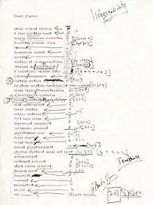 维维尔使用的特定音素是特意为其“情感内容”以及它们与发声器官所唱的音符的频率的关系而选择的。[219][220]他使用带有变音符号的修改版拉丁字母来表示这些声音,但偶尔也会借用其他书写系统的字形,包括西里尔字母。[181]大多数自创语言的单词由单一音节组成;多音节的单词在手稿中经常有意用连字号表示。[221]