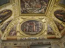 天花板包括一块大的中央面板,四周排列着四块矩形面板,在长边上,每边都有两幅椭圆形绘画。周围是莱昂纳多·里卡雷利和乔瓦尼·迪·托马索·博斯科的灰泥,马里奥·迪·弗朗切斯科为其镀金。