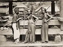 三个巴塔克武士拿着长矛和剑站在木制建筑前面,狗趴在左边的两根木梁之间。克里斯滕·费尔贝尔拍摄于约1870年。