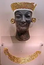 有金片和已燒焦象牙的古舊克里斯里凡亭雕像。德爾菲考古學博物館。