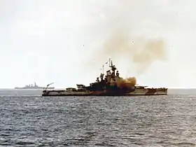 內華達號正在炮擊硫磺島。攝於1945年硫磺島戰役