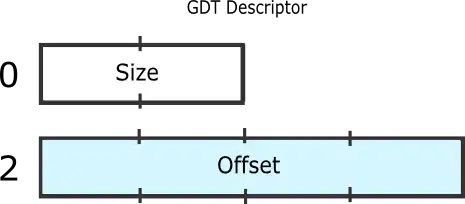 GDT description structure描述了GDT的位置及大小(并非GDT的一部分)。储存于GDTR 寄存器中。可通过LGDTR指令从内存中往GDTR中加载GDT description structure。