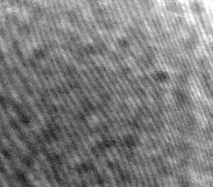 右图所示为一张在漫射光背景下拍摄的全息照片,照片上已经记录了全息的光信息。图中所示的区域的大小为大约8x8毫米。全息摄影中记录下来的是光线强度的随机变化,这个变化称为客观散斑。胶片中规则的线条是由光线在装载胶片的玻璃板中多次反射产生的干涉条纹。直接观察全像術的胶片时是无法根据记录的结构辨识出所拍摄的物体的,就像无法根据留声机在唱片上留下的刻痕直接读出音乐一样。当使用激光束照亮全息摄影胶片的时候,观察者可以看到拍摄的物体(右边这张照片拍摄的一辆玩具汽车),这是因为激光可以由胶片衍射,从而重建物体散射出的光线。