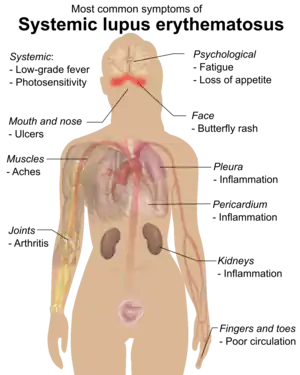 全身性紅斑狼瘡患者的免疫系統產生自身抗体攻擊自身細胞和組織,導致發炎和組織損害。症狀的嚴重程度因人而異,常見症狀包含关节疼痛和肿胀(關節炎)、發燒、胸痛、脫髮、口腔潰瘍、淋巴結腫大、疲倦,及典型的臉部紅疹等等,本疾病的病情會隨病程有所變化,病情較嚴重的時期稱為「發作」(),病情較輕微的時期則稱「緩解」()[1]。
