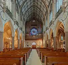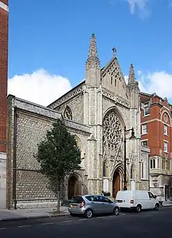 风格是装饰哥特式,农场街立面模仿博韦主教座堂。祭坛由奥古斯塔斯·普金设计[4][5]。