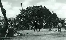 大一新生们被期待在搭建篝火的过程中证明他们的价值。[3]在此后将近二十年中,学生搭建篝火的材料为杂物和各种途径得来的木头,有时甚至不惜使用非法手段,如1912年挪用了用于建造宿舍的木材。[6]1935年,一个农民举报说,学生们扛走了他整个谷仓的木材用作篝火燃料。为杜绝此类事件的发生,大学将篝火设为校立项目。次年,学校开始提供斧头、锯子及卡车给学生,并指示他们去城镇边缘的一片死树林去获得木材。[5]