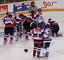 - 1984年4月20日,在一场蒙特利尔加拿大人对阵魁北克北方人队的比赛中,所有球员在第二节结束的时候参加了冲突。在第三节比赛开始之前,由于对判罚有意见,又一次发生了所有球员参与斗殴的情况。 那场比赛,双方一共被处罚了252分钟的离场时间,10名球员被直接逐出场外。这场比赛直接导致了裁判布鲁斯·胡德在赛季结束后退休。[62]