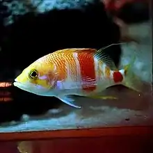 本魚體呈橘紅色,腹部白色,體側有數條不明顯的紅橫帶,以在背鰭硬棘5枚,軟條14至16枚,第六硬棘至第一鰭軟條處的紅帶最顯著,但此帶未達腹部,臀鰭硬棘3枚,軟條7枚。口大;下頜前端具小犬齒。尾柄上亦有一顯著大紅斑,其後上方的尾鰭處亦有一小紅斑。背鰭的第二鰭條和尾鰭上葉都特別延長。尾鰭略凹。前鰓蓋骨下緣無前向棘。體被細小櫛鱗,主上頜骨及頤部皆具鱗;側線完整,側線鱗孔數33至36枚,側線上鱗3列。體長可達22公分。