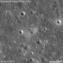 2019年4月11日19时23分(UTC),探测器在下降过程中引擎在离月球表面约10公里处停止工作,同时与飞行控制中心失去联系,并以每秒130多米的速度撞向月球[10][11]。内塔尼亚胡承诺,以色列的宇宙飞船将在未来两三年内重返月球[4][12]。