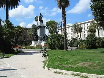 在中央花园,由尼哥底母·塞韦(Nicodemo Severi)建于1895年和1911年 [2], 矗立着一座政治家纪念碑:一尊青铜雕像 在花岗岩平台和大理石基座上 [2] 四面环绕着四个寓言人物,分别代表意大利和罗马,思想和行动。 [3] 工程由斯特凡诺·加莱蒂设计,1885年奠基,1895年完成,历时十年。 [2]