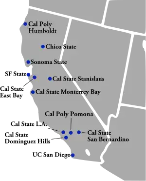 | 加州州立大学东湾分校 | 海沃德 | 1957年 | 公立 | 13,124 | $8,518,000 | Pioneers | 2009年 | 0 | 0 |